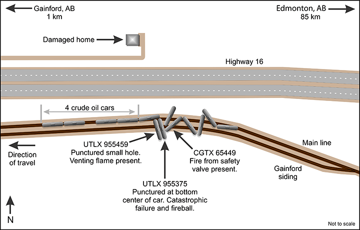 At about 0100,Footnote 1 while travelling on the Edson Subdivision, the train entered Gainford siding to meet eastbound train 416. It had proceeded about 3300 feet into the siding when a train-initiated emergency brake application occurred. When the train came to a stop, the crew looked back and observed flames from their train. The crew uncoupled the locomotives from the rest of the train and left the immediate area as the fire was increasing in intensity. The crew then made the necessary emergency broadcast and notified the rail traffic controller. There were no injuries.