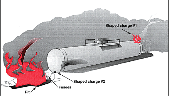 The vent and burn procedure is performed by placing 2 explosive charges on the affected tank car. One charge is placed at one end of the car at the highest point, which is typically in the “vapour space.” The other charge is placed at the opposite end of the car at the lowest point, which is typically in the “liquid space.” The vapour space charge is first ignited. The charge creates a hole in the tank shell, ignites the vapours as they vent to atmosphere, and relieves pressure in the tank. Once the pressure has been relieved, the second charge is ignited. This opens a hole in the liquid space, which allows the liquefied gas to drain out of the tank into a pre-excavated pit area where it is burnt off to atmosphere (Figure 4).