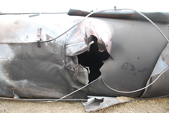 • The 18th car (UTLX 955375) was struck and punctured in the underside by the coupler from the 21st car (Photo 1). It lost its pressurized load of LPG, which exploded in a fireball that stretched north across Highway 16.
