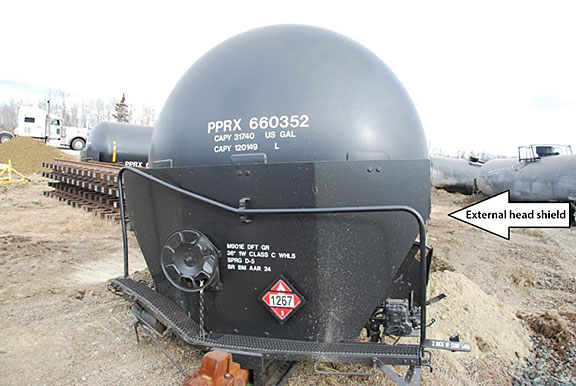 The 4 derailed cars transporting petroleum crude oil were designated as DOT 111A100W1 or DOT 111S100W1. The non-pressure tank cars were designed for general use. The tank thickness of the 111 tank cars was 7/16 inch. The 3 DOT 111A tank cars were equipped with external head shield protection (Photo 2). The DOT 111S tank car was equipped with the head shield incorporated into the design of the car (Photo 3).