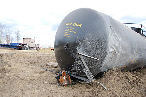 2. While double shelf couplers are designed to keep derailed tank cars coupled together, and tank car ends have been strengthened to withstand end impacts, tank car bodies are vulnerable to side impacts when derailed cars come apart.
