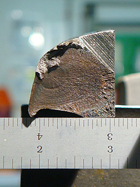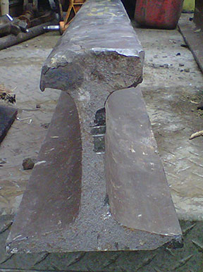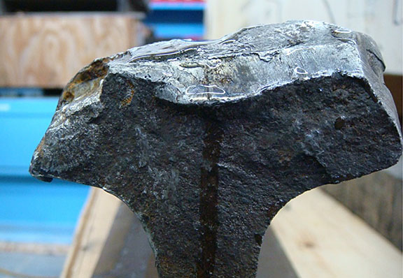 4. Critical size for 1 of the transverse defects was reached when the remaining rail head area, which was at or near its wear limits, could no longer support the load, resulting in the sudden and complete failure of the rail.