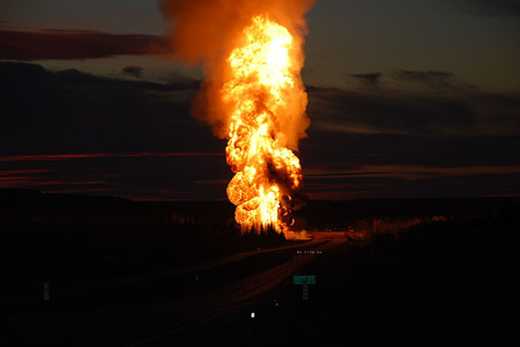 On 19 October 2013, at 0100 Mountain Daylight Time, Canadian National Railway Company freight train M30151-18, proceeding westward from Edmonton, Alberta, to Vancouver, British Columbia, derailed 13 cars, including 4 tank cars containing petroleum crude oil and 9 tank cars of liquefied petroleum gas (LPG), at Mile 57.25 of the Edson Subdivision, near Gainford, Alberta. Of the derailed LPG tank cars, 2 were breached and caught fire. A third LPG tank car released product from the safety valve and ignited. About 600 feet of track was destroyed. There were no injuries. A total of 106 homes in the vicinity of the derailment were evacuated.