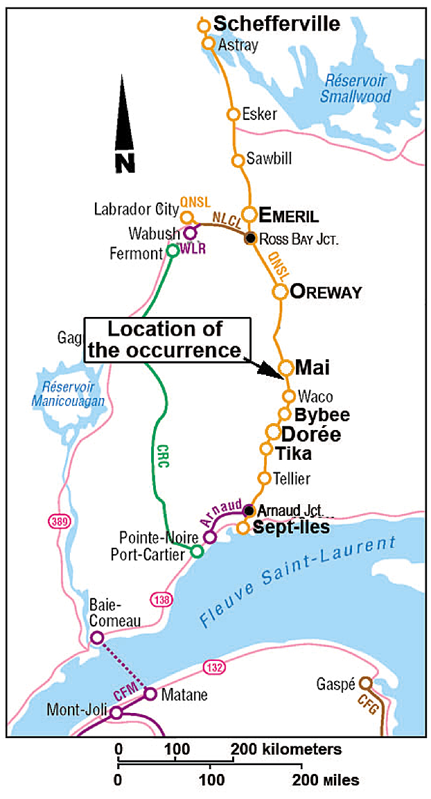 On 10 January 2013, at approximately 2000Footnote 1, Quebec North Shore and Labrador Railway (QNS&L) freight train FCN-05 (train FCN) departed the yard at Sept-Îles, Quebec, Mile 8.9 on the Wacouna Subdivision, travelling northward to Schefferville, Quebec (Figure 1). The train consisted of 3 locomotives and 55 loaded cars. It was about 2190 feet in length and weighed approximately 3950 tons.