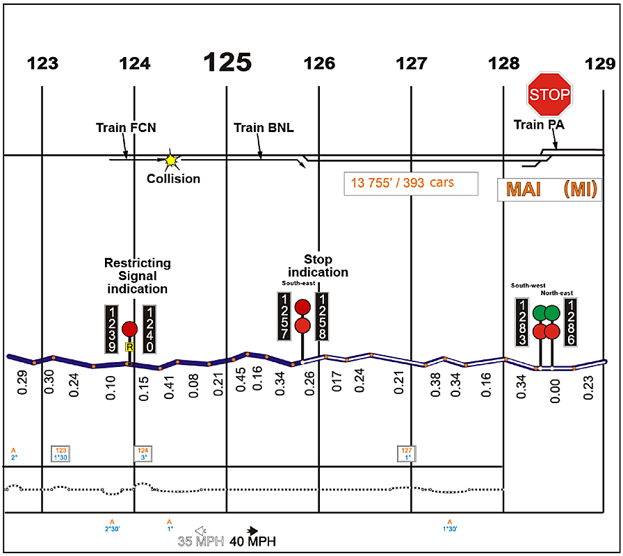 | 0013:57 | Train FCN passes signal 1219 indicating Clear to StopFootnote 4. Train is travelling at a speed of 30.3 mph. Position of locomotive 424 (train BNL): Mile 125.62 (speed of 1.7 mph in order to enter the siding). |
