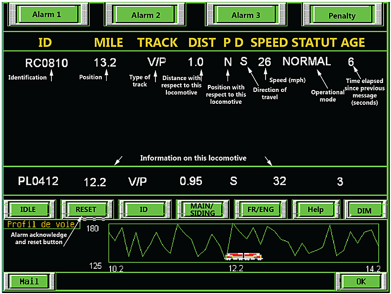 The PDD displays the distance between rail vehicles along with the other positions received. This distance calculation does not take into account the length of a train and only provides the distance between vehicles that have an onboard PDD. The distance must be interpreted by the engineer. When the separation between locomotives is less than 8, 5 or 3 miles, a visual warning indicating the alarm level (1, 2 or 3) is displayed on the screen and an audible warning is sounded (identical for all 3 alarm levels). To acknowledge receipt of type 1 and 2 alarms, the engineer must press the button on the crew alertness device located near the PDD screen or click on the “REARMER” button on the PDD screen itself. For type 3 alarms, the engineer must first press the button on the crew alertness device within 10 seconds of the alarm, and then click on the “REARMER” button in the next 5 seconds. If an engineer fails to acknowledge receipt of a type 2 or 3 alarm within 10 seconds, the system triggers automatic braking of the rail vehicle.