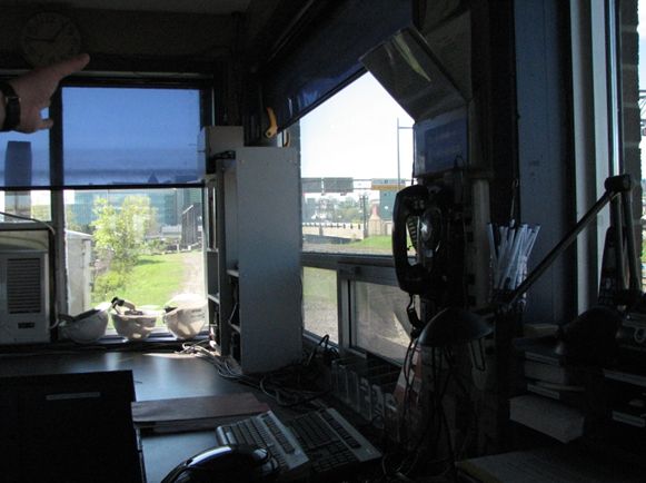 The gatehouse of the White Birch Paper mill is located on the northeast side of the entrance to the plant from Boulevard des Capucins. The guard is responsible for controlling the road vehicles going into and out of the plant and for ensuring their safety at the level crossing. The inside of the gatehouse is set up to allow the guard to monitor and control road traffic and pedestrian traffic. Large glass windows provide a view of the vehicles going into and out of the paper mill. The workstation has several pieces of communications equipment, along with various screens and knobs to control the gates, the bell, and other devices. The layout of the guard's desk and the guard's field of view are conducive to monitoring road traffic to the right. However, the field of view toward Gare du Palais is restricted by the building's pillars and several bookcases (Photo 1).
