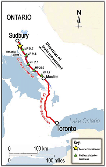 After departing Toronto, the train proceeded northward on the CP Mactier Subdivision and then on the CP Parry Sound Subdivision. The train passed over 5 CP hot bearing detectors (HBD)Footnote 2, located at Mile 4.7, Mile 26.0, Mile 51.1, Mile 74.6, and Mile 94.7 (Figure 1). No HBD alarms for this train were recorded at these locations.