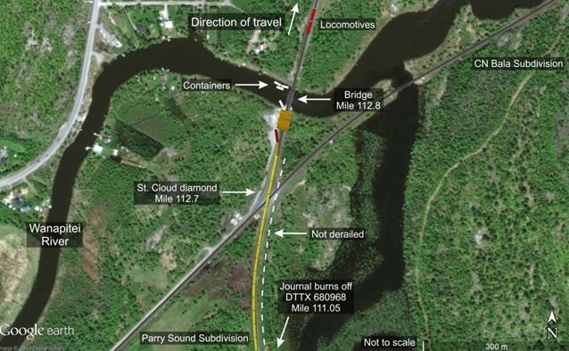 The second head-end locomotive was placed in the train with the locomotive cab facing the rear of the train. A review of the lococam video recovered from the second locomotive revealed that at about 0954, while travelling at 35 mph at Mile 111.05, the first car behind the locomotives, DTTX 680968 (a single-well double-stack container car), began to lean slightly to the east. Approximately 2 minutes later, the car derailed just as it traversed the Canadian National (CN) St. Cloud diamond crossingFootnote 3 located at Mile 112.70. The 5 following cars also derailed. Some of the derailed cars impacted the south end of the Wanapitei River railway bridge at Mile 112.80 (Figure 2).