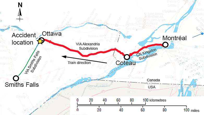 The VIA Smiths Falls Subdivision consists of a single main track that extends from Mile 0.0, located 6.0 miles (9.7 km) west of the VIA Ottawa Station, to Smiths Falls, Ontario (Mile 34.40). Train movements on the Smiths Falls Subdivision are governed by the centralized traffic control system, as authorized by the Transport Canada (TC)–approved Canadian Rail Operating Rules (CROR) and supervised and directed by a RailTerm rail traffic controller (RTC) located in Dorval, Quebec.