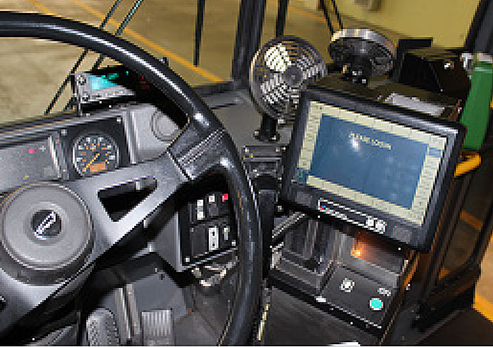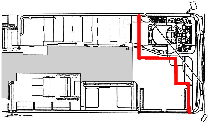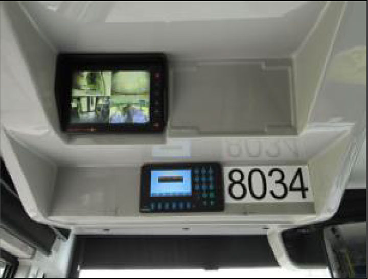 The driver asked a group of 3 or 4 passengers standing at the front of the bus to stand behind the yellow line on the floor. With the bus still stationary, the driver looked at the bus video monitor, located on a forward panel above the driver station and to the left of the driver seat. The video monitor display (6 inches [15.2 cm] wide by 3¾ inches [9.5 cm] high) was divided into 4 quadrants, each measuring 3 inches (7.6 cm) wide by 17⁄8 inches (5 cm) high. Each quadrant displayed a view from 1 of 4 on-board video cameras. The bottom right quadrant displayed a rearward-facing view from the front of the upper deck.