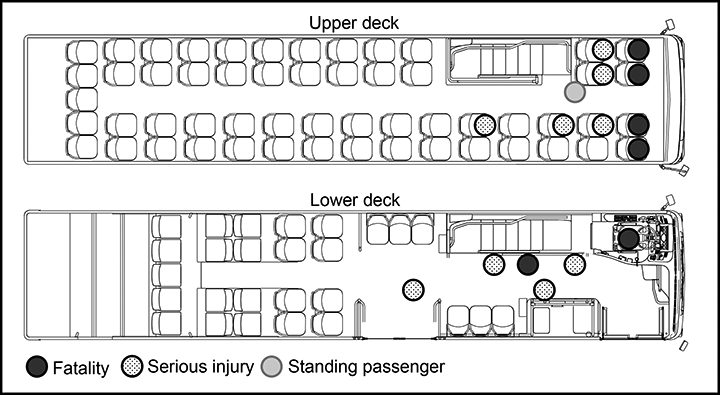Four passengers seated in rows 2 and 3 of the upper deck were also ejected from the bus. These 4 passengers and a 5th passenger in the 5th row of the upper deck as well as 4 passengers on the lower deck sustained serious injuries.