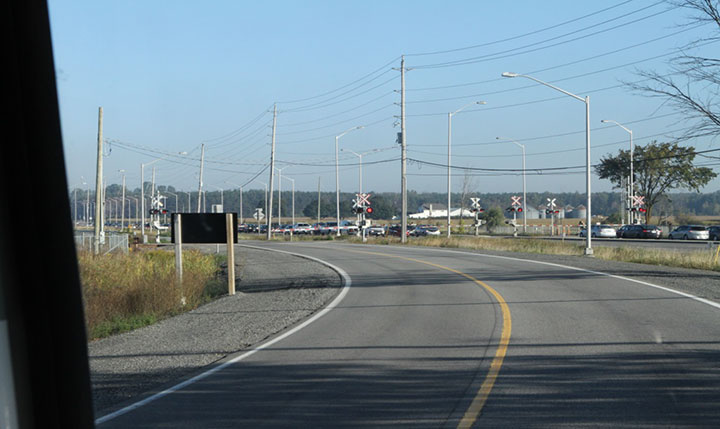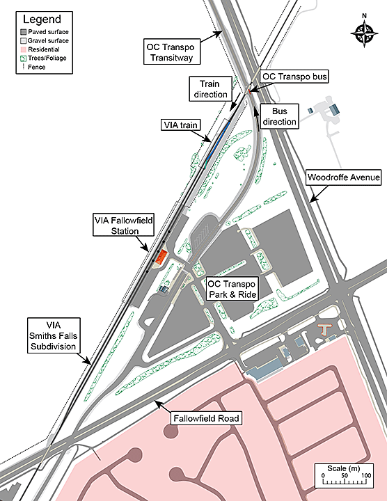 In the vicinity of the accident, there was a main track and a 2298-foot-long (700 m) siding, which is located just north of and parallel to the main track, between the Woodroffe Avenue (Mile 3.28) and the Transitway (Mile 3.30) crossings, and the Fallowfield Road (Mile 3.88) crossing. A number of VIA trains only traverse the Woodroffe Avenue/Transitway crossings as they either originate or terminate at the VIA Fallowfield Station. From Monday to Friday, up to 23 passenger trains and 2 freight trains operate over the Woodroffe Avenue/Transitway crossings each day. Similarly, up to 16 passenger trains and 2 freight trains operate over the Fallowfield Road crossing (Mile 3.88) each day (Appendix B).