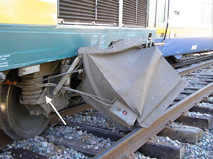 Impact marks were present on the left rear truck of VIA 915, just behind the underframe-mounted battery box (Photo 6). The battery box had separated. The electrical wiring providing power to VIA 915 was severed, and the locomotive event recorder (LER) had stopped recording. The rear truck of VIA 915 had derailed to the north side of the rails, on the crossing.