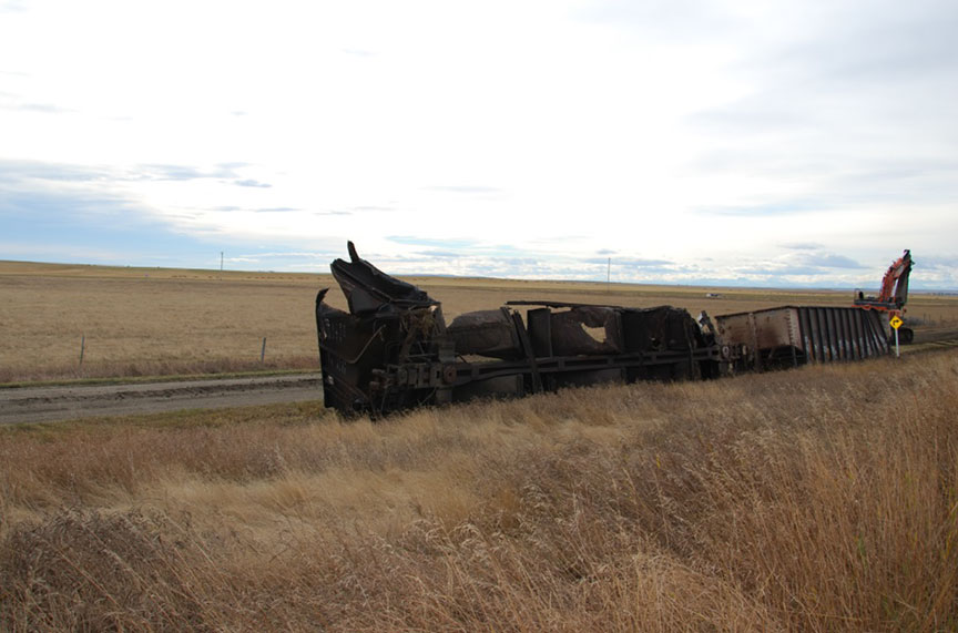 Just before the derailment, a train-initiated emergency brake application occurred. After making the necessary emergency broadcast and notifying the rail traffic controller (RTC) in Calgary, the conductor performed an inspection of the train and determined that the tail-end 17 cars had derailed in 2 groups. The last 10 cars had derailed at the west storage track switch at Pearce (Figure 2). Some of these derailed cars struck 2 empty gondola cars that had been stored in the storage track adjacent to the main track (Photo 2). The other 7 derailed cars were dragged about 1000 feet east and remained upright.