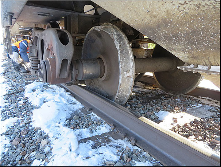 Examination of the eastbound track, from the site of the car pile-up, showed the presence of grooves in the snow and impact marks on the rail anchors and tie plates that extended up to car CRDX 15109 (13th car). This car came to a stop at Mile 151.44, and the trailing axle of its leading truck (Photo 1) had derailed.