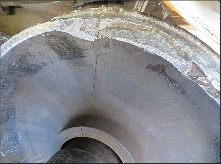 The L3 wheel had separated from the wheel seat and shifted inward. Its wheel tread was broken and a section measuring about 24 inches had separated. An open crack extended across the wheel web, from the wheel tread to the hub (Photo 2). The R3 mating wheel showed significant shelling on its entire circumference.