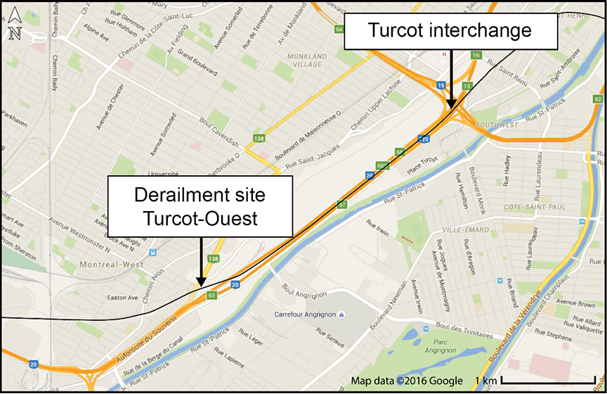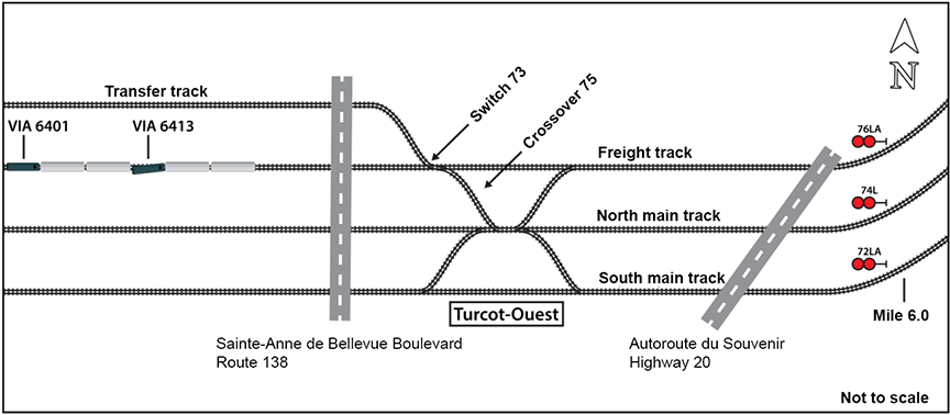 The derailment occurred at Turcot-Ouest, on the section of track between the Autoroute du Souvenir (Highway 20) overpass and the Sainte‑Anne-de-Bellevue Boulevard (Route 138) overpass. This area is affected by the Turcot interchange reconstruction project, which aims to replace several overpasses and shift the railway tracks to the north. There are 4 signalled railway tracks: the south main track, the north main track, the freight track, and the transfer track. Several crossovers allow movement from one track to another (Figure 2).