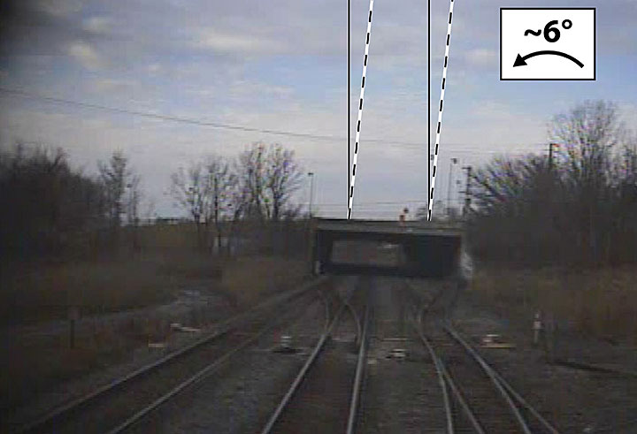 As the train travelled at about 60 mph,Footnote 2 approximately 600 feet from the crossover located at Mile 6.26 (crossover 75), the crew noticed that the switches were in the reverse position, aligned for the freight track. The train brakes were fully applied. As it passed through the crossover at a speed of 55 mph, the train swayed from side to side (Photo 1, Photo 2, and Photo 3), then came to a stop on the freight track, about 1600 feet after the crossover.