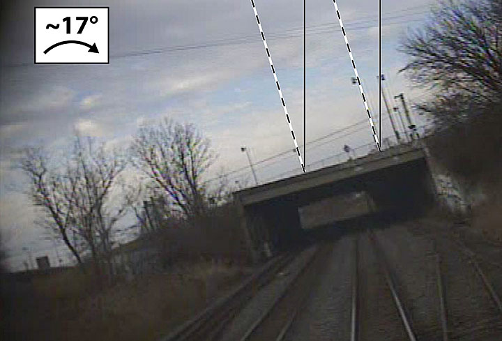 When the train entered crossover 75, it was travelling at about 55 mph, while the authorized speed for this type of crossover is 15 mph. Based on still images from the locomotive forward-facing cameras, while negotiating the crossover, the train swayed from side to side. These oscillations are due to dynamic forces caused by the high speed and the change in curvature at the crossover. These forces tend to push rolling stock to the outside of the curve and cause tilting and weight transfer, which could lead to wheel lift. In this occurrence, the angle reached was 17 degrees and, as a result, the wheels completely left the rail surface. The dynamic forces caused by the 55 mph speed of the train and the geometry of crossover 75, which was designed for a speed of 15 mph, caused a transfer of weight that resulted in a wheel lift and the derailment of locomotive VIA 6413.