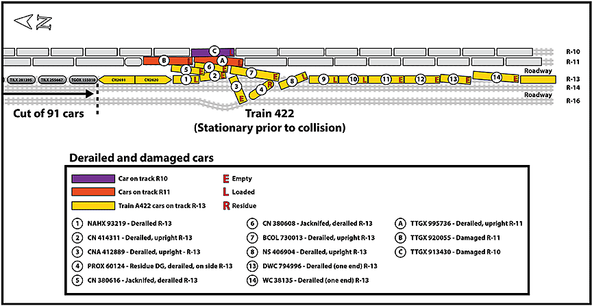 The collision occurred about 5900 feet south of switch 18. The force of the collision shoved both head-end locomotives on train 422 about 350 feet back onto its consist, resulting in the derailment of the 1st to 8th cars and the 13th and 14th cars behind the locomotives. The 3rd car (empty box car CNA 412889) diverged westward across track R-14 and a roadway, and displaced 60 feet of track R-16. The 5th and 6th cars (empty covered hopper cars CN 380616 and CN 380508) jackknifed vertically and then fell eastward and struck 2 loaded multi-level auto carrier cars (TTGX 920055 [damaged] and TTGX 995736 [damaged and derailed]) that were stationary on adjacent track R-11. Multi-level auto carrier car TTGX 913430 on track R‑10 was also damaged. Six freight cars were destroyed. Approximately 585 feet (180 m) of track from tracks R-13, R-14 and R-16 was damaged (Figure 3). None of the cars of the uncontrolled cut of cars derailed.