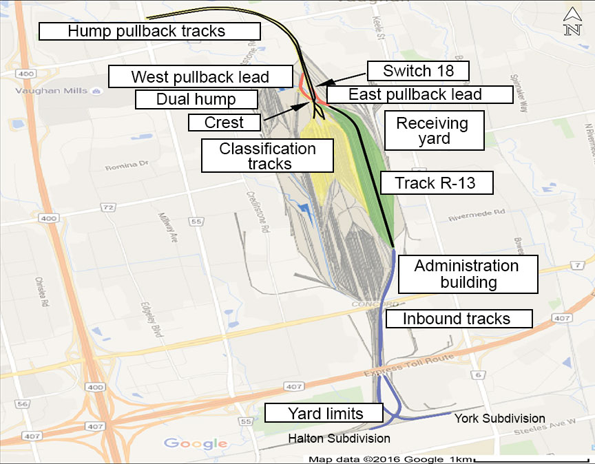 On 29 July 2015, Canadian National Railway Company (CN) MacMillan Yard Hump Assignment YDHF01 (the assignment) was switching in MacMillan Yard, located in Concord, Ontario, part of the Greater Toronto Area (Figure 1). The locomotive hump set, located at the head end of the assignment, consisted of 2 locomotives separated by 2 booster units. They were ready to pull 91 cars (64 loaded cars and 27 empty cars) onto the hump pullback track in preparation for humping. The assignment was about 6100 feet long, weighed about 9000 tons and was being controlled by a single conductor operating a remote control locomotive system (RCLS) known as a Beltpack.Footnote 1 The conductor was familiar with yard operations, met fitness and rest standards, and was qualified for the position.