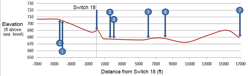 Consequently, in the description of the track profile in section 1.4, the “crest of the hump” has been replaced by switch 18; the grade from the top of the east hump pullback track to switch 18 has been changed from 0.6% to 0.5%; it has been made clear that the east pullback lead track south of switch 18 descends for 800 feet at a grade of an average, not maximum, of 2.5%, after which it transitions to a shallow descending grade. A note has been added to Figure 5 (track profile) indicating that the figure is not to scale.
