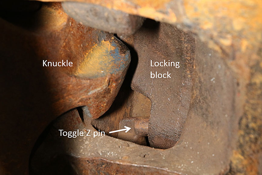 - The wear within the lock-lift assembly of the B-end coupler for CN 44257 allowed excessive lateral movement of the toggle Z pin such that it jammed in the locking block hole and prevented the block from completely dropping and locking into place.