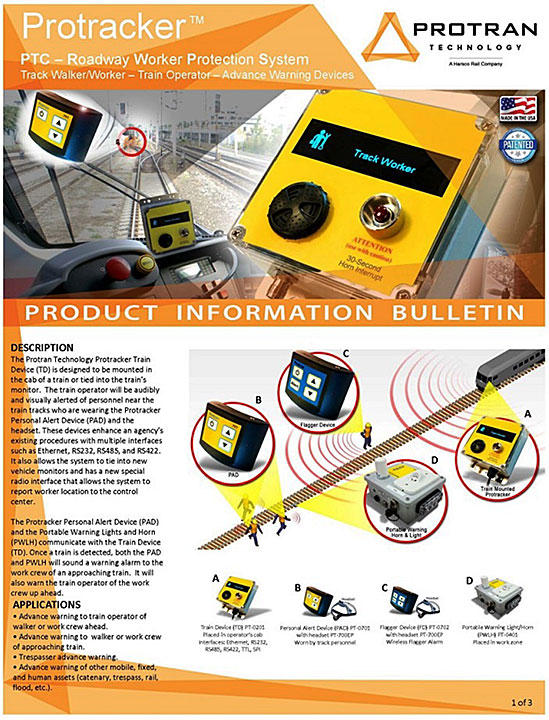 - advance warning devices such as Protracker, developed by Protran Technology: this system provides advance warning to track workers and train crews and is used by a number of United States railroads and transit companies; and