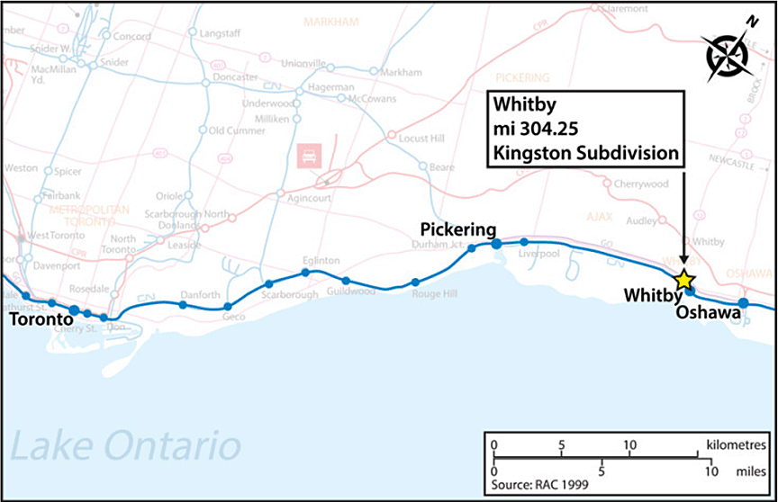 In the vicinity of the occurrence, there are 2 main tracks between Oshawa West (Mile 303.3) and Pickering Junction (Mile 311.4). Train movements on the Kingston Subdivision are governed by the centralized traffic control (CTC) system as authorized by CROR and supervised by a CN RTC located in Toronto. Daily train traffic consisted of about 16 freight trains and 30 VIA passenger trains. The maximum authorized timetable speed for passenger trains in the area of the incident was 95 mph. At the time of the occurrence, there was a temporary slow order from Mile 304 to Mile 304.5 on both tracks, restricting trains to a maximum of 65 mph.