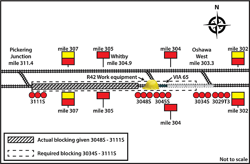To protect the situation, the RTC had to block the south track between Signal 3034S (Mile 303.4, Oshawa West) and Signal 3111S (Mile 311.1, Pickering Junction). However, the RTC incorrectly entered signal blocking between Signal 3048S (located at Mile 304.8 at Whitby) and Signal 3111S on the south track. The RTC advised the foreman that the south track had been blocked between Whitby and Pickering Junction, excluding the crossovers on each side. The foreman did not make a record of this information, nor was he required to do so (Figure 2).