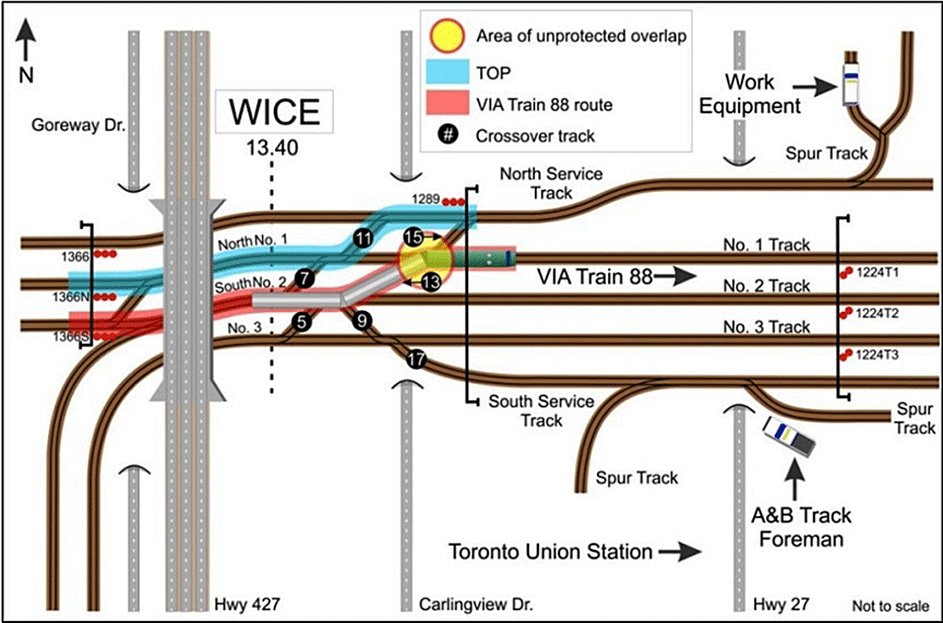 When the RTC requested the initial TOP for the A&B track foreman, the RTC II system automatically lined crossover No. 11 in the reverse position and placed electronic blocking from signal 1289 on the North Service Track through crossover No. 11, and through the No. 1 track westward to signal 1366N. However, the RTC II system did not specifically block crossovers Nos. 13 and 15. Without these crossovers being blocked, a routing option was available to VIA 88, which resulted in overlapping a portion of the TOP.