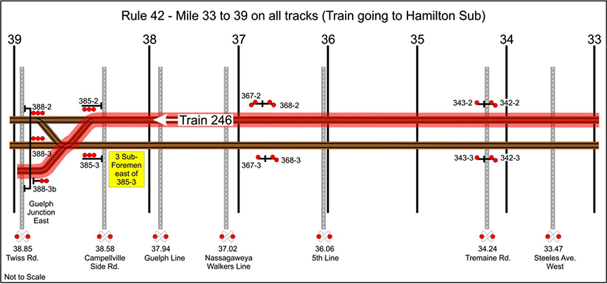 As westbound train 246-04 (the train) approached Mile 33, the train crew called the foreman for permission to operate through his limits. The foreman authorized the train crew to proceed on the north track from Mile 33 to Mile 39. However, the train had been lined by the RTC from the north track to the south track at Signal 385-2 (following a verbal agreement between the RTC and the foreman), as the train was destined for the Hamilton Subdivision, which required accessing the south track at Guelph Junction. The foreman then instructed the train to cross over to the south track at Signal 385-2, with permission to use the south track between Signal 385-3 and Signal 388-3 (Guelph Junction East). These instructions to the train were also in writing.