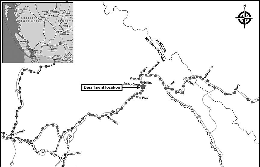 On 13 January 2015, Canadian Pacific Railway (CP) Train 199-10 (train 199), originating in Field, British Columbia, was travelling westward on the Mountain Subdivision, destined for Vancouver, British Columbia. The train consisted of 3 head-end locomotives and 43 cars (20 loaded cars and 23 empty cars, totalling 111 platformsFootnote 1). The train weighed about 4775 tons and was 6812 feet long.