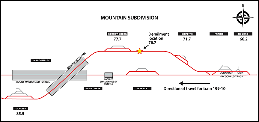 After receiving confirmation from the director, the RTC rerouted train 199 through the Connaught Tunnel. Upon receiving the rerouting details, the train crew advised the RTC that, because of the steep grade between Fraine and Stoney Creek, they would need to run from Rogers through to the siding at Stoney Creek without stopping to ensure that the train would not lose momentum.