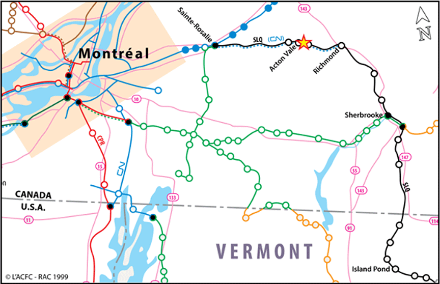 Work began to the west of turnout 272. The warning devices of the 3 level crossings located in central Acton Vale (Saint-André, du Marché, and Dalpé streets) had been disabled during the work to prevent unnecessary disruptions to road traffic. At approximately 1200, one of the machines broke. Because the machines work in tandem, both machines were moved to the Acton Vale quarry so that the broken machine could be repaired. The route leading to the quarry required the switches at turnouts 272 and 273 to be handled and the derail located at the entrance to the quarry to be placed in the non-derailing position.