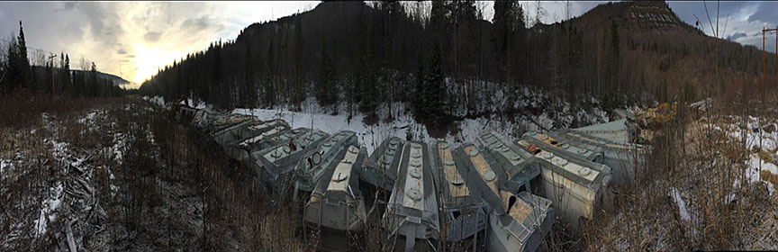 The first car (CEFX 312560) behind the head-end locomotives remained coupled and was not derailed. The 2nd to the 29th cars derailed. The 2nd and 3rd cars derailed to the high side of the curve and were on their sides. The 4th to 26th cars were in a jackknifed position across the rails (Figure 2). The 27th, 28th, and 29th cars were derailed upright on the grade.