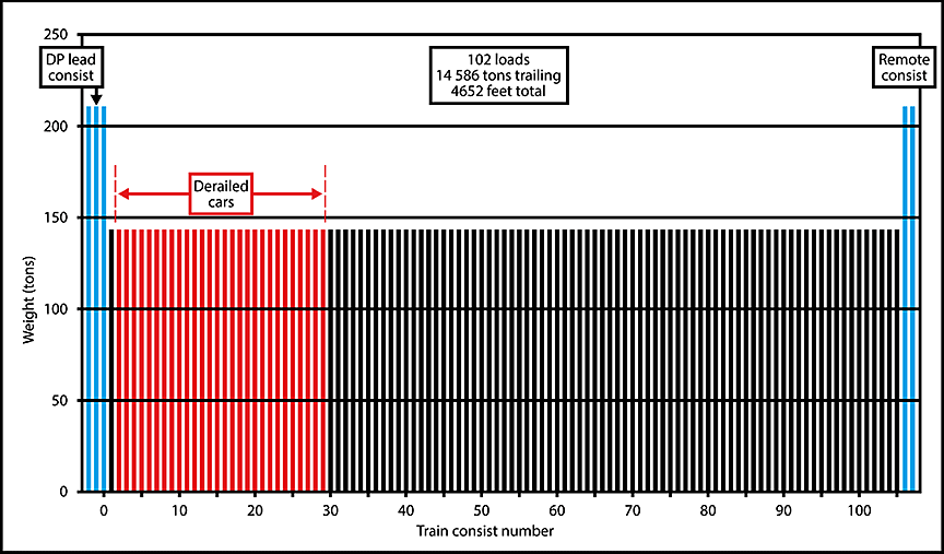 In this occurrence, the unit train of frac sand weighed 14 586 tons over 4652 feet, which is equivalent to 3.1 tons/foot of train length. Grain trains are typically operated at about 2.0 tons/foot of train length.
