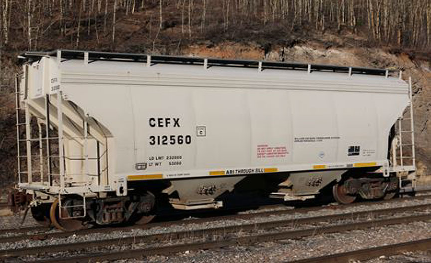 The 42-foot covered hopper cars are shorter than grain and coal hopper cars. However, when loaded with frac sand, these cars would normally carry about the same load as the longer grain and coal hopper cars.