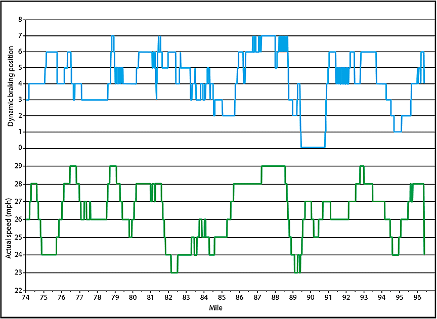The data from the locomotive event recorder was reviewed to determine how the train was handled on the descending grade between Grey (Mile 73.0) and the point of derailment (POD) (Mile 96.38). The train speed ranged between 23 mph and 29 mph, exceeding the maximum speed of 25 mph (Figure 5). The dynamic brake (DB) was placed in position 6 and position 7 several times, exceeding the limit of DB5 (Figure 5).Footnote 12