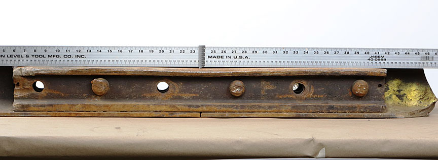 A 34-foot plug rail (1987 Sydney) had been previously installed in the high rail near Mile 96.38. Prior to the occurrence, both joints for the plug rail were reported to be fully bolted. Following the occurrence, both joints were intact, but the nuts (on the gauge side) for 3 bolts had been sheared off on each joint (Figure 6). The plug rail was also broken near the south joint.