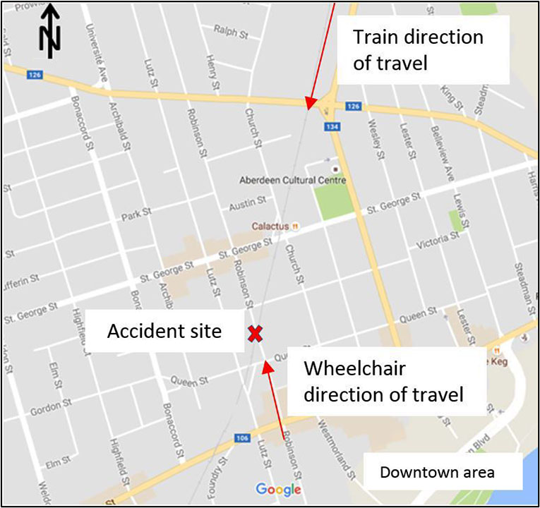 At about 0140 on 27 July 2016, the train was travelling on the Springhill Subdivision at 30 mph and approaching the Moncton downtown area (Figure 2). The train's headlights were on full power, the ditch lights were on, and the bell had been activated due to the presence of multiple crossings at grade. As the train crested a small hill, a blue light in the distance became visible. As the train approached the blue light, the silhouette of a person in a wheelchair could be seen on the track at the Robinson Street crossing (Mile 124.43). The locomotive horn was immediately activated, and the locomotive engineer applied the brakes. The train was unable to stop before striking the wheelchair, fatally injuring its occupant.