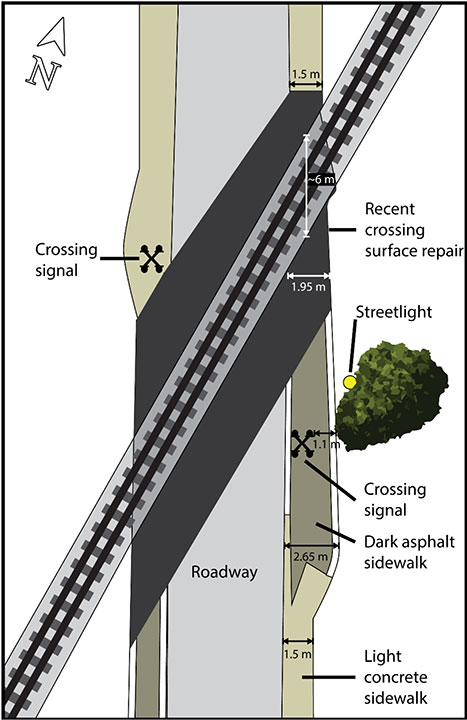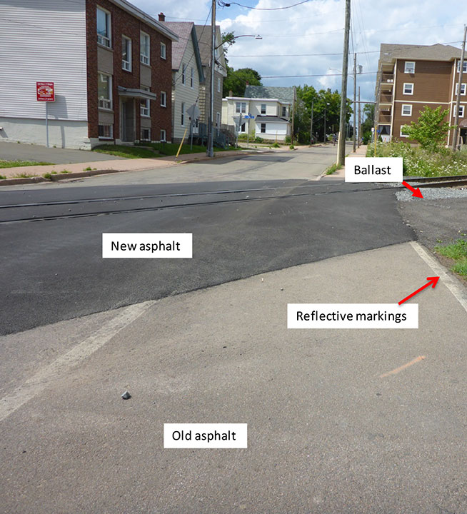 The new asphalt was darker in appearance than the old asphalt, and it was darker than the concrete sidewalk on the approach to the crossing. There were no painted reflective lines on the newly asphalted portion of the sidewalk at the crossing. The easternmost reflective line ended approximately 3 to 4 m before the south rail (Figure 5).The new asphalt was irregular and did not follow the edge of the sidewalk (normally delineated by a reflective white line).