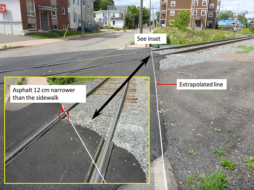 At the south rail, the asphalt covered the rubberized flangeway, which extended 48 cm beyond the edge of the sidewalk (Figure 7).