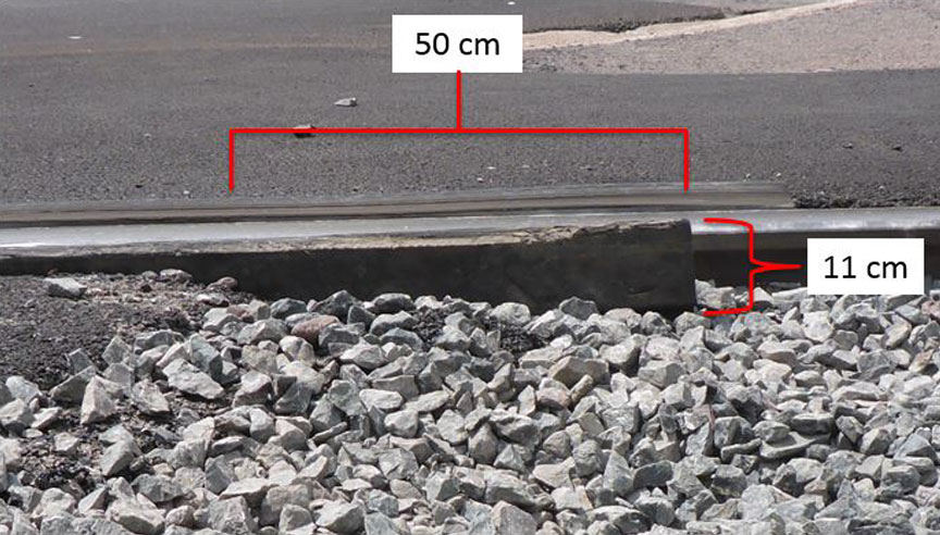 At the north rail, the asphalt stopped about 50 cm short of the end of the rubberized flangeway, creating a void in the sidewalk surface. At its eastern extremity, the rubberized flangeway had a height of about 11 cm above the ballast (Figure 8).