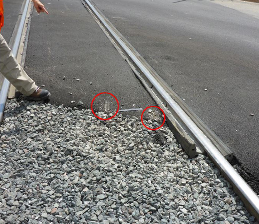 Two gouge marks were present on the asphalt between the rails at the eastern extremity of the crossing (Figure 9). The distance between these marks was about 35 cm (13.8 inches). In front of these marks, the ballast was disturbed. The deformations in the ballast were slightly wider apart (approximately 50 cm) than the gouge marks on the asphalt.