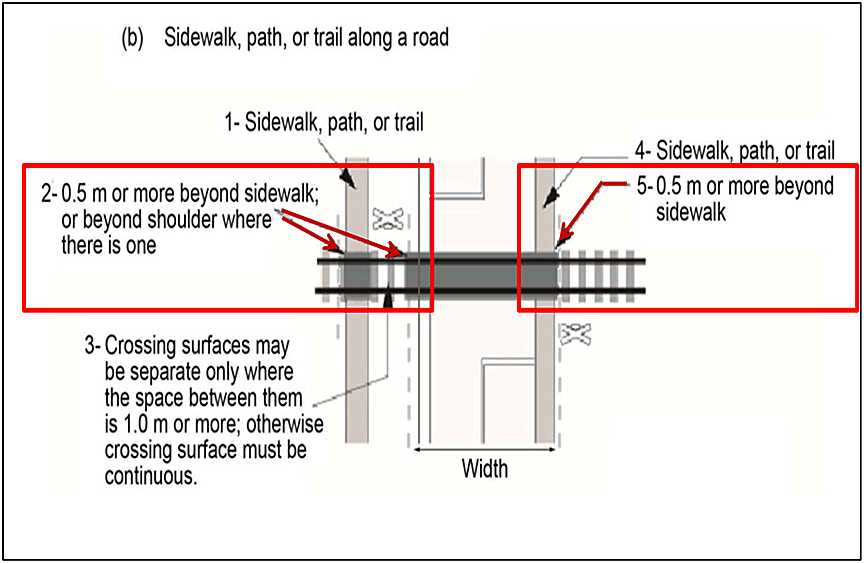 The CN ETS (June 2011) require sidewalks to be 1.5 m (5 feet) wide. For new crossings, the ETS require the crossing surface to be extended an additional 0.5 m beyond the crossing edge at the tracks.