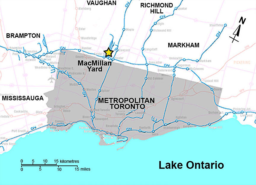 The CN York Subdivision extends from MacMillan Yard (Mile 25.0) to Pickering Junction (Mile 0.0). There are multiple main tracks from Mile 25 to Mile 23.92, double main track from Mile 23.92 to Mile 12.33, and single main track from Mile 12.33 to Mile 0.0. Train movements are controlled by the centralized traffic control system (CTC), as authorized by the CROR, and supervised by an RTC located in Toronto. The junction switch for the Bala Subdivision is at Mile 18.72.