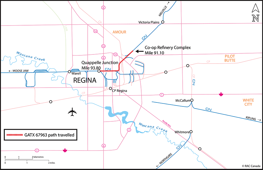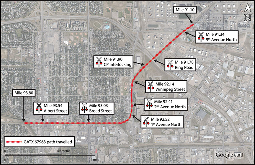 A short time later, conductor 2 located car GATX 67963, which had come to a stop at approximately 0007, after travelling up an ascending grade near Quappelle Junction (Mile 93.80). The car had rolled uncontrolled for approximately 2.7 miles and had traversed 7 public roadway crossings and a railway interlocking (Figure 3).