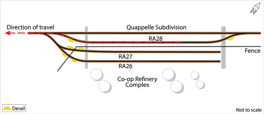 On 01 March 2016, at approximately 2335,Footnote 1 the Cando Rail Services (Cando) 2200 Co-op Refinery Complex (CRC) assignment (the assignment) was switching tank cars on CRC asphalt loading tracks RA26 and RA27, located adjacent to Mile 91.10 of the Canadian National Railway Company (CN) Quappelle SubdivisionFootnote 2 (Figure 1). The assignment was made up of 1 locomotive. The crew consisted of a locomotive engineer (LE) and 2 conductors (conductor 1 and conductor 2). All crew members were fully qualified for their respective positions, met fitness and rest standards, and were familiar with the territory.